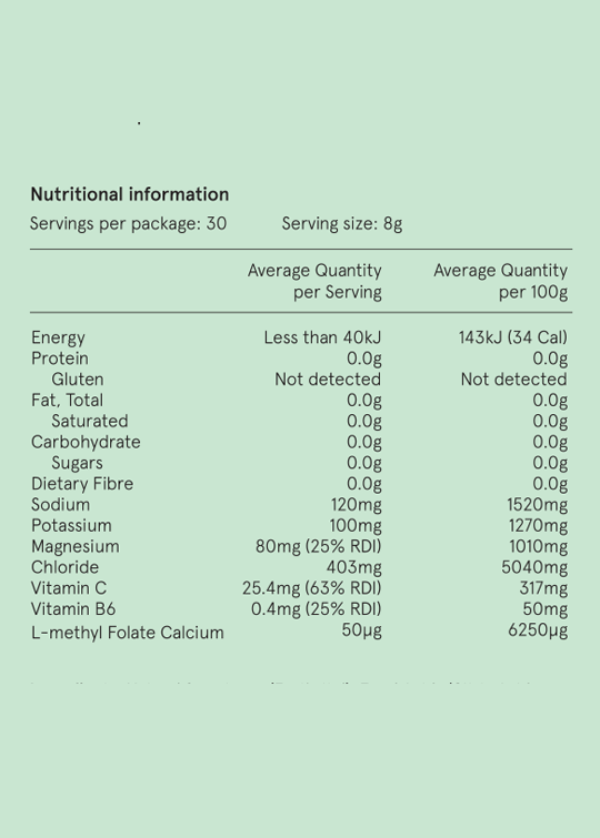 Electrolyte Mineral Salts Blend: Magnesium Chloride, Sodium Chloride, Mono Potassium Phosphate, Sodium Citrate. This blend helps to ensure you are hydrated to the optimal level.