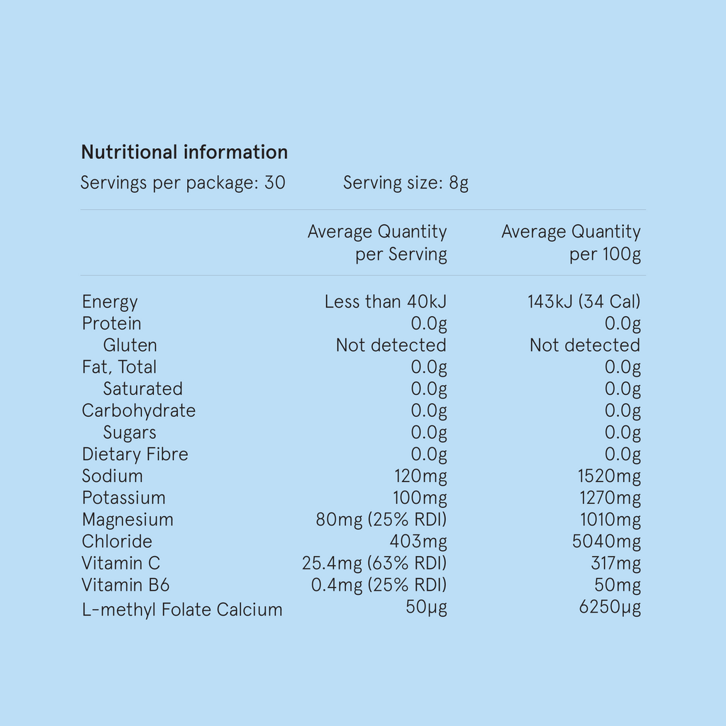 Natural Sweetener (Erythritol - natural food grade derived from vegetable), Mineral Salts (Magnesium Chloride, Sodium Chloride, Mono Potassium Phosphate, Sodium Citrate) Natural Flavours derived from vegetable and fruits, Natural Colours derived from vegetables and fruits, Vitamins (Ascorbic Acid, L-Methyl Folate Calcium, Vitamin B6 - Pyridoxine Hydrochloride).
